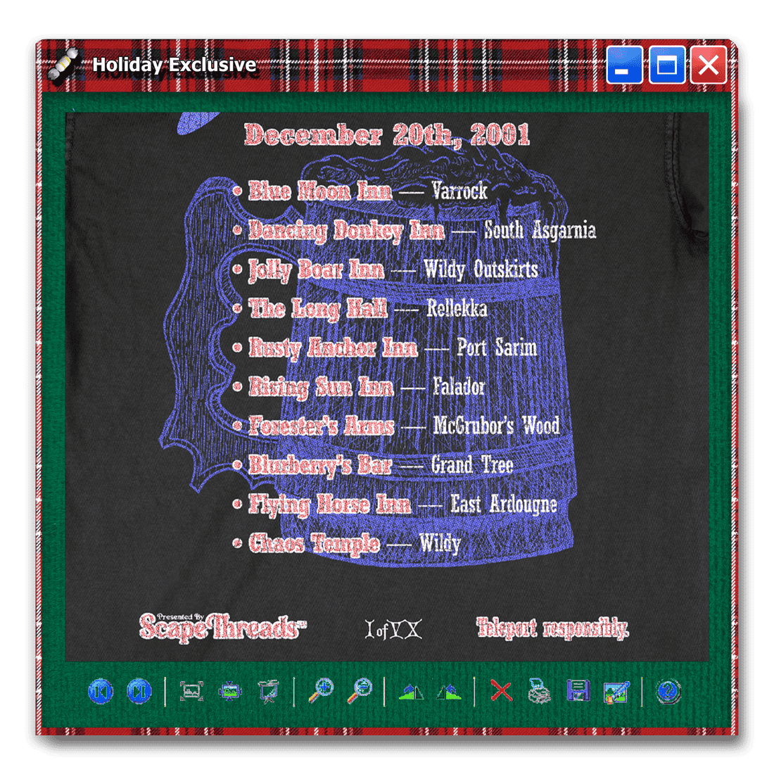 Found in a crate washed ashore at Port Sarim. Re-introducing the ’01 Gone in Gielinor Vintage Tee. With locals speculating a drunkard tossed the crate into the Western Sea after last call—This garment-dyed relic maps the taverns across the chest, and the back records the route and date.